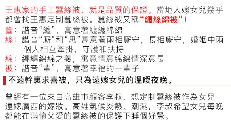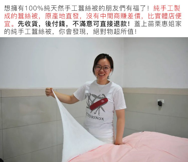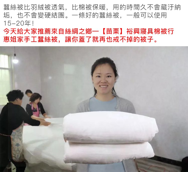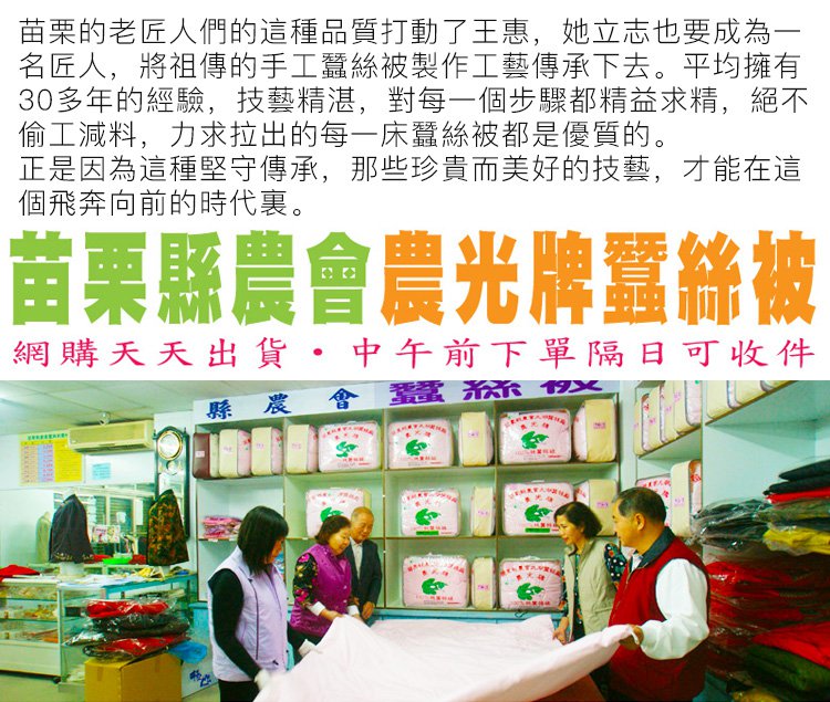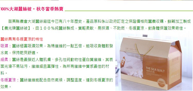 苗栗縣農會大湖蠶絲廠迄今已有八十年歷史,鮮繭加工製成【農光牌蠶絲被】,由100%純蠶絲製成,質輕柔軟、易排濕、不助燃、冬暖夏涼,對身體保護效果奇佳。今年因疫情影響很多國外訂單無端退貨,導致大量滯銷的絲被!無奈網路售賣活動,在保證成本的情況下0利潤銷售!
